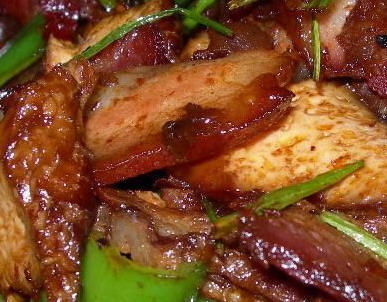 香干燜回鍋肉:把半瘦半肥的豬肉煮熟煮爛,冷卻后切成塊,香干也切塊,一同放入缽中,加水,放干紅辣椒、蒜粒、鹽、醬油,蓋蓋。文火慢煨至熟。因肉的鮮味在慢煨中滲入香干,使香干中帶了肉的鮮味、肉中又帶了香干之香,其味收雙玉合壁之效。它也是古鎮(zhèn)人百吃不厭的一道家常菜。
