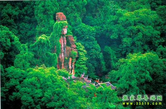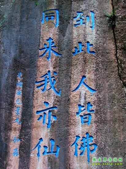 不二門內(nèi)由石灰?guī)r風(fēng)化形成的一尊巨大石佛,聳立于萬綠叢中,高六丈,青冠白面,頭頂白云,腳踏碧水,人們以其形神稱為“觀音巖”?!队理樋h志》稱“觀音巖素有‘湘景名峰第一巖’之稱”。觀音巖下,聳立著一組瑰麗多姿、古色古香的殿閣建筑群,這就是“嵩山堂”,包括三觀殿、玉皇閣和禪房客舍,工藝精巧,玲瓏別致。特別是正殿后的地藏庵,與老司城明代建筑祖師殿結(jié)構(gòu)相似,背倚石壁,右通八陣圖,左達(dá)熱水坑,周圍怪石森列,古木參天。觀音巖北部山上是天造地設(shè)的“八陣圖”,有的如排戟,有的似春筍;有的像古佛,有的若走獸。八陣圖之奇,不僅在于它林立的怪石,最主要的是在于由龜裂紋石板鋪成的時上時下時隱時現(xiàn)的彎彎小徑——或穿過地下幽深的石洞,或延展于密林雜草叢中,或環(huán)繞于奇峰怪石之間,使八陣圖的東、南、西、北四門相通,復(fù)雜繁多的石徑互相連接形成網(wǎng)絡(luò),人們有時難以找到出路。也許,這就是八陣圖命名的緣由。不二門內(nèi)兩側(cè)石壁開闊如屏,歷代文人墨客或贊山水之幽絕,或抒心胸之豪情,雕鑿了種種摩崖石刻。據(jù)《永順縣志》記載,不二門石刻有神秀獨鐘、吾道南來、白云門開、砥柱中流、眼前南海、百寶勝光、別開生面、別有天地等100多處。歷經(jīng)風(fēng)雨滄桑之后,現(xiàn)僅存鬼斧神工、勝境無雙、滌盡塵氛、瞻奇仰異、海上飛來等數(shù)十處。清代名士白介庵所作《松徑留云》、《古洞仙蹤》、《層閣聳翠》、《玉嶂屏環(huán)》、《澄潭月影》等觀音巖八景詩尚凸現(xiàn)在石壁之上。其中《石門天鑿》一詩完整無缺:“法門高聳五云偎,鬼斧神工妙化裁。鞭石無痕還著相,振山有鐸不須錘。地沾花雨千歧坦,道接薪傳一線開。莫道終南稱捷徑,巨靈神辟小蓬萊。”清代庚辰年間的探花景元,曾在石壁上題刻“到此人皆佛,同來我亦仙”。他還以一筆揮成的“山青海岸”疊字如圖似的符合成一個“岸”字鑿刻在摩崖之上,堪稱罕世之作。石壁上近年來還鐫刻了偉人毛澤東的詩詞和儒將蕭克、畫家黃永玉等巨擘的題字,游人置身其間,飽享山水美景、名勝古跡與文化藝術(shù)的熏陶。