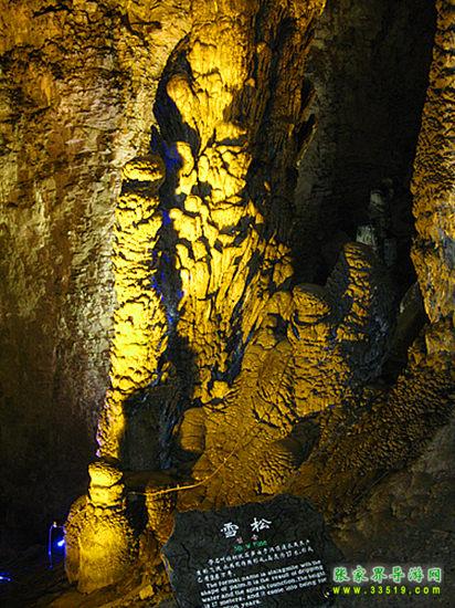“大雪壓青松,青松挺且直。要知松高潔,待到雪化時(shí)。”這根高大的石筍就像一棵被大雪覆蓋得嚴(yán)嚴(yán)實(shí)實(shí)的松樹(shù)。它的科學(xué)名稱叫做棕櫚狀石筍,一般只能在高大的廳堂中見(jiàn)到。據(jù)科學(xué)家測(cè)算,它已經(jīng)在悠悠的歷史長(zhǎng)河中挺立了10萬(wàn)年。有趣的是,在雪松根部還散落著許多可愛(ài)的小松果呢!