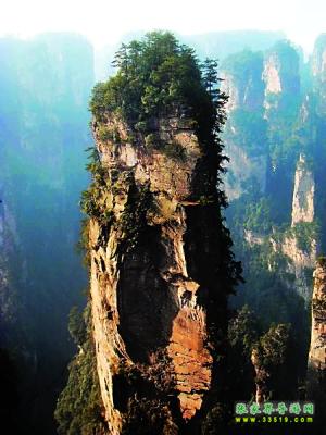 憑欄俯視,300余米高的峭壁猶如斧劈,草木叢生,幽洞玄奧,但聞水聲,不見(jiàn)溪谷。溪畔50米處一巨峰高達(dá)300余米,腰圍數(shù)十米,渾圓如柱,雄偉離奇。相傳共工與顓頊爭(zhēng)奪帝位失敗后怒觸不周山,折了天柱,飛來(lái)半截于此,故名乾坤柱。爾后許多神仙云游此地,留下不少古跡。此柱南有數(shù)條直達(dá)山頂?shù)木G色峽谷,似神仙往來(lái)的通道。右邊一峰柱,上不有如一只皮靴,稱(chēng)神靴巖,相傳是曹?chē)?guó)舅扔下的一只不合腳的靴子。觀景臺(tái)右側(cè)那株根部彎曲的古松名鐵拐松。