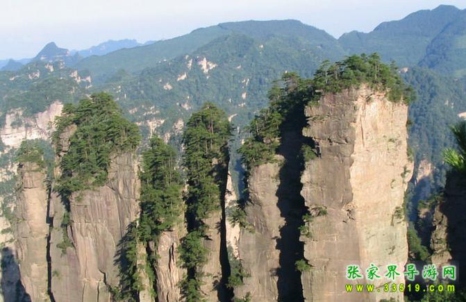 黃石寨西北崖沿下,6座高達(dá)200多米的橢圓形石柱,呈南北向一字排開(kāi)在黃石寨與袁家界之間約2000米長(zhǎng)的溝谷中。石柱大小和間距相當(dāng),柱頂皆為平臺(tái),似一派待建橋面的橋墩。中間兩墩稍高,兩邊漸次降低。各柱頂可連成一條弧線,氣勢(shì)恢宏。橋墩下河床干涸,怪石嶙峋,樹(shù)木依稀,顯得古野、蒼涼。雨天,云霧滿壑,似一江怒濤,橋墩時(shí)隱時(shí)現(xiàn)。若逢?yáng)|邊日出西邊雨時(shí),便有絢麗壯闊的彩虹南北飛架,與橋墩形成雙美合壁的奇觀。
