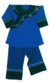 邊。男捆腰帶,女套繡花圍裙。頭上均包青布帕或絲帕,男帕左方垂一節(jié)過耳,婦女全包頭。未婚閨女留長(zhǎng)發(fā)扎辮,用紅頭繩扎上下兩端,額前前留“劉海”。已婚婦女挽上發(fā)管,別簪,插銀首飾。褲子多為青、藍(lán)色、上結(jié)白布褲腰,褲腳短且大。青壯年男子打綁腿,女褲以對(duì)襯色布加邊,上綴三條均等的梅花條,腳上穿青布瓦鞋,包白色裹腳布。若遇喜慶節(jié)日或走親訪友,則另有一番梳妝打扮,如加佩牙簽、銀牌等。