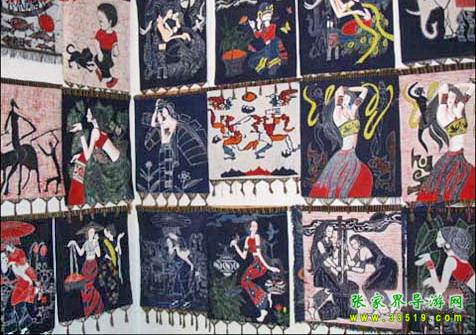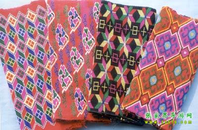 織錦。又名“西蘭卡普”、“土花鋪蓋”,為土家族傳統(tǒng)工藝品之一,是森林公園工藝品廠的主要產(chǎn)品??楀\是在特制的本質(zhì)織機(jī)上以錦紗為經(jīng)、五彩絲線為緯、手工提花織成。以其質(zhì)地厚實、堅韌,色彩鮮艷,格調(diào)古樸,流暢生動著稱。圖案有花草、鳥獸、生產(chǎn)、生活、幾何、字樣等種類。為舊時土家姑娘必備嫁妝之一。據(jù)考證,早在漢代,土家織錦就作為方物貢入漢室宮廷。20世紀(jì)后,土家織錦曾漂洋過海至日、美、英等國展出,并作為禮品,被國家領(lǐng)導(dǎo)人贈送給外國元首及政府官員,如今織錦以壁掛、枕巾、沙發(fā)墊、桌圍、提袋、服飾等多種式樣遠(yuǎn)銷世界各地。