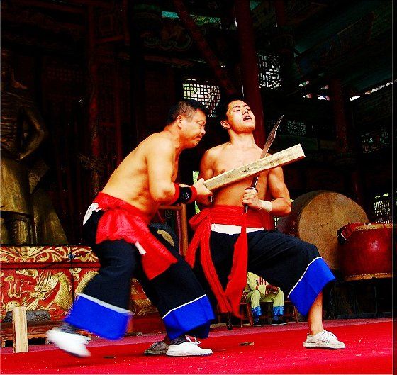 大庸氣,堪稱武林奇葩,曾為祖國贏得聲譽,海內(nèi)外享有極主名望。 大庸氣功是大庸各民族特別是土家族傳統(tǒng)體育項 目之了,分健體氣派、武術(shù)氣功兩類。前者有“返還 功”、“馬王推氣功”、“少林達摩醫(yī)療保健氣功” 等;后者有靜坐、壁虎、靈子、二指彈、碎石、松靜 、硬氣、五禽、五陽功等,尤以硬氣功著稱。大庸硬 氣功,歷史悠久,漢代相單程,明代覃后,清代劉明 燈,當(dāng)代湯子模、周鐵鞭、杜心武、趙繼書等都具有 超人硬氣武功。大庸土著民族在漫長的反征服、反壓 迫斗爭,博采武當(dāng)、少林南北派、昆侖派眾家武林精 華,創(chuàng)造出獨此一家的大庸硬氣功。 據(jù)傳,大庸硬氣功鼻祖是楚國鬼谷子?!队蓝h 志》有關(guān)鬼谷子隱居天門山鬼谷洞潛心學(xué)《易》、傳 授方術(shù)的記載。到清代有武林高手朱茂嶺,隱居三岔 村北芭蕉灣洞,研究鬼谷氣功之術(shù),后收西溪坪胡口 子、余世萬(即“余通人”)為徙,傳其衣缽。余通 人將武術(shù)氣功系統(tǒng)整理,發(fā)揚光大,播名于世。 新中國成立后,黨和政府十分重視民間氣功發(fā)掘 整理,并正式列為體育項目加以普及發(fā)展,今日大庸 市習(xí)練硬氣功達數(shù)萬人眾。永定區(qū)官黎坪村世有“硬 氣功之鄉(xiāng)”盛譽,該村男女老幼,練功已蔚成風(fēng)氣, 其武師趙繼書,1979年先后參加全省和全國武術(shù)大賽 ,均獲一等獎,受到國家體委重視,同年7 月趙繼書 專程到北京給中央領(lǐng)導(dǎo)同志匯報表演。嗣后,隨同中 國武術(shù)代表團和國家領(lǐng)導(dǎo)人先后兩次出國,到盧森堡 、意大利、比利時、羅馬尼亞、馬其他和東南亞等國 家訪問。他表演的臥刀碎石、頭頂開石、雙鳳灌耳、 頭碰石柱、叉尖推磨等精彩節(jié)目,博得外國友人好評 。盧森堡一位榮獲國家獎牌的武士,看了表演后連夜 來到中國大使館,將自己珍藏多年的獎牌贈送給他; 盧森堡國王主動熱情走上臺與趙繼書熱情擁抱,連連 稱贊:“了不起!了不起!國際氣功大師!”并把珍 藏紀念章一枚贈送給趙繼書。一位法國朋友十分贊賞 說:“中國的氣功,稱為全人類的寶貴財富,是有科 學(xué)道理的。”自此,大庸硬氣功譽滿全球。湖南瀟湘 電影制片廠專門拍攝了彩色紀錄片《大庸氣功》。 大庸硬氣功共有二十多個項目,最有影響的是: 腹臥鋼叉 由二人在地面扶住一根叉尖朝上的三 股鋼叉,叉尖猁鋒利,然后一個俯身叉尖,尖抵腹部 ,待其四肢平展懸空,扶叉二人轉(zhuǎn)動鋼叉,謂之推磨 。表演時,要求臥叉者運氣于腹,氣意集中,稍有大 意,叉即穿腹而過。 臥刀破石 先固定兩把大刀,刀口朝上,臥刀者 運氣后,由其他人抬臥于刀口上(有仰臥、俯臥兩種) ,然后在臥刀者腹部或背部置一碩大石條(約數(shù)百斤) ,一人或兩人輪大鐵錘狠擊石條直至斷裂破碎為止。 釘?shù)洞财剖?地上倒一層碎玻璃片,一人仰臥其 上;然后腹上置釘床,又一人仰臥釘床上,再于第二 人腹上置釘床,第三人仰臥刀床上,腹部上壓一塊數(shù) 百斤大條石,由人掄錘狠砸,至石破為止。 銀槍刺喉 用一根兩頭安有鋒利槍頭的鋼槍,抵 置兩位表演者喉部,然后相對發(fā)力,至槍桿抵成彎弓 形而喉部安然無恙。 徙手斷石 表演者將堅滑如鐵一塊卵石置于石凳 (地)上,然后運氣于掌或指擊斷(碎)卵石。 踢腿斬石 表演者運氣于腿,以腿踢斷石條。一 般可踢斷15公分以上厚度的麻石條或青石條。 胸部打刀 將鋒利大刀刃口置于胸部肌肉上,用 一根拳頭粗木棒猛擊刀背,至棒斷而胸部無傷。 新中國成立以來,大庸民間武術(shù)與民族體育逐漸 融為一體,發(fā)揮著提高人民身體素質(zhì)、弘揚中華武術(shù) 傳統(tǒng)和增進國際友誼重大作用。除硬氣功外,還有數(shù) 十種武術(shù)形式散見于民間武術(shù)體育活動之中。如打飛 棒、扭扁擔(dān)、抵搭斗杠、擠油渣、甩抱腰、舉石鎖、 板牛角(一種斗牛形式)等等。其特點是因地制宜, 不分場地,凡田園地角院壩集鎮(zhèn),都是習(xí)武練功、開 展活動的處所,頗具泥土氣息。擬或以生活中某些動 作和動物的某種形態(tài),稍加模仿演繹,便成某一獨特 武術(shù)形式。如天門武術(shù)功夫大師余道人所創(chuàng)造的“宮 天梳”、“巖燕樸天門”等;也有就地理特點創(chuàng)造某 種武功形式的,如“蕩藤”等。