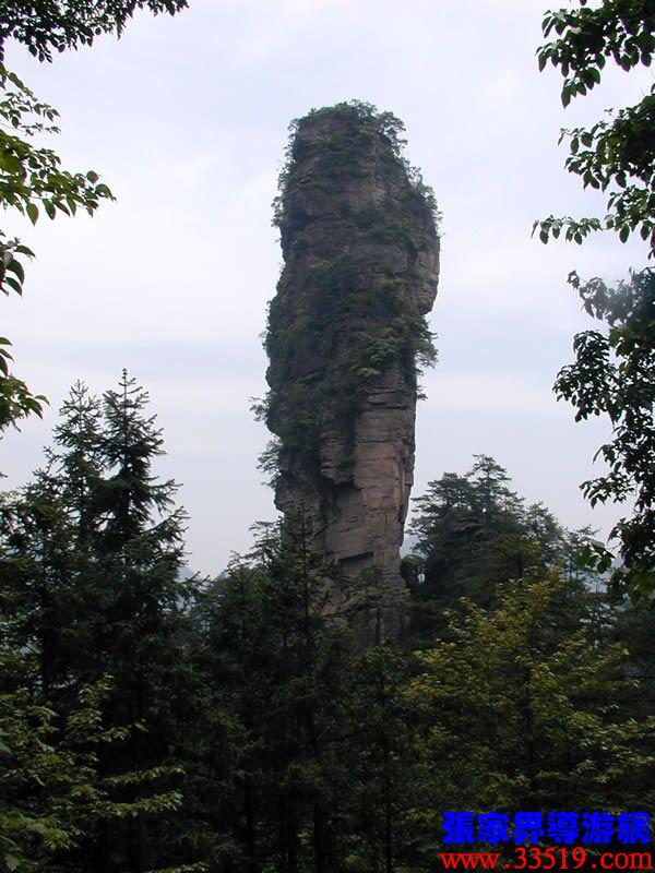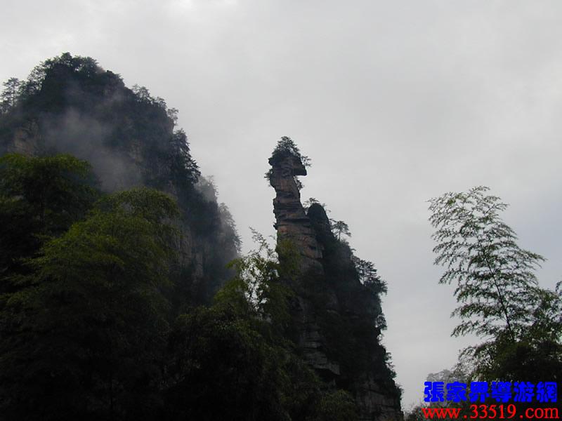 在整個武陵源風(fēng)景名勝區(qū),類似“天書寶匣”這種形態(tài)各一的景觀比比皆是。因此,您盡可以發(fā)揮各自的想像力,給它們?nèi)∫粋€有意思的名字。大家看,右前方那座高高的石峰,像不像掛著的一塊石碑?那就是龜精倉惶中丟下的天書,民間叫“天書高掛”,三個山峰之間正中的那個山峰,像不像只報曉的金雞?傳說龜精盜天書之時,正趕上金雞報曉,故名金雞報曉。