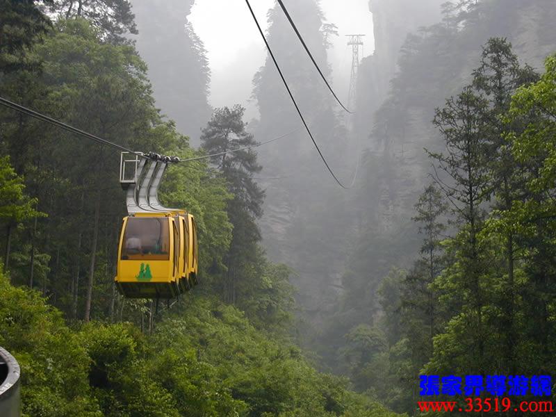 (索道站)現(xiàn)在,我們就要乘索道下山了。黃石寨(黃獅寨)索道是1995年5月至1997年9月臺灣證吉興業(yè)有限公司與張家界公園管理處合資興建的我市第一條觀光索道。索道線路水平距863,高差431米,運行速度每秒8米,單向小時運量948人,設(shè)備全部從法國波馬公司引進(jìn),總投資4000多萬人民幣。黃石寨(黃獅寨)索道的建成,為公園開辟了一條空中游覽線,填補(bǔ)了張家界無觀光索道的空白。古詩說:會當(dāng)凌絕頂,一覽眾山小。乘索道觀張家界公園,別是一番感受。