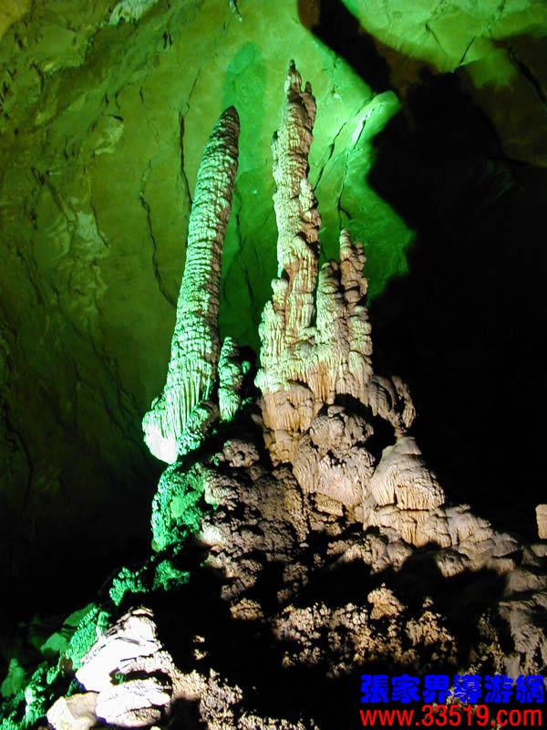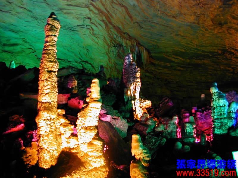 (龍宮)龍宮是黃龍洞十三個大廳中最大的一個,也是景色最美的景點之一,底面積15000平方米,平均高40米,兩千余根石筍拔地而起,千姿百態(tài),異彩紛呈,或如飛禽走獸,或如宮廷珍藏,有的像巍巍雪松,有的像火箭升空。龍宮后園有金銀兩座花池,清水常溢,花簇盛開。宮頂鐘乳柳垂簾掛,四周壁畫栩栩如生。溶解著各色各樣的礦物質(zhì)的水,從巖層中滲透出來,滴落下來。礦物質(zhì)在洞頂凝固結(jié)晶成倒懸鐘乳石,從鐘乳石滴落的水又把礦物質(zhì)澆疊、堆壘在洞底,而長成節(jié)節(jié)向上的石筍。大家看看這龍宮的造型,領略這磅礴的氣勢。洞內(nèi)最大石筍,高12米、直徑10米的漢白玉天然石椅“龍王寶座”居高臨下,眾多石柱石筍似人似物,維妙維肖,圍著寶座朝拜山呼,幾十座珊瑚亭亭玉立,儼然一支龐大的“宮廷樂隊”。湖南著名教授羊春秋先生作《寄生草》詞對此進行描繪:“百態(tài)千姿模樣,三宮六院門巷。龍王開宴設瓊漿,猴王偷果鬧天堂,君王納寵擁羅帳。搬演了人間爭攘,匯集了天下奇觀。”