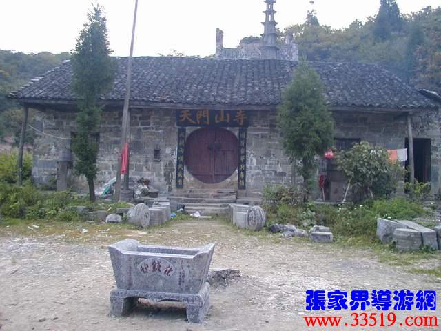 (天門山寺)天門山寺最早建于唐代,古稱云缽庵、靈泉院、嵩梁堂,明代時,因擇址不當而屢遭風摧又常遭水荒,才將天門山寺從東部山頂遷移至此。以前這里古木參天,濃蔭蔽日。古寺門楣上刻有“天門仙山”四字,大門兩邊的對聯(lián)是:“天外有天天不夜,山上無山山獨尊”,傳為李自成部將野拂撰書。進門為大佛殿后面有觀音堂,兩邊六間平房,最后一棟是祖師殿,規(guī)模宏大。民間概括為“三進堂、六耳房,磚墻鐵瓦鍋如壙”。山寺原建筑十分講究,飛檐翹角,雕龍畫鳳,并塑有佛道神像菩薩等。還有大鼓一面,千斤大鐘一口,一座七級石塔和一個大化錢爐。據(jù)碑刻記載,自清乾隆至民國五年的163年間,天門山寺共修葺過七次,香火曾盛極一時,湘鄂川黔邊境十多個縣的信徒絡(luò)繹不絕,都來這里進香拜佛?,F(xiàn)天門山旅游股份有限公司正在大規(guī)模地修復(fù)天門山寺,昔日的繁華又將重現(xiàn)。