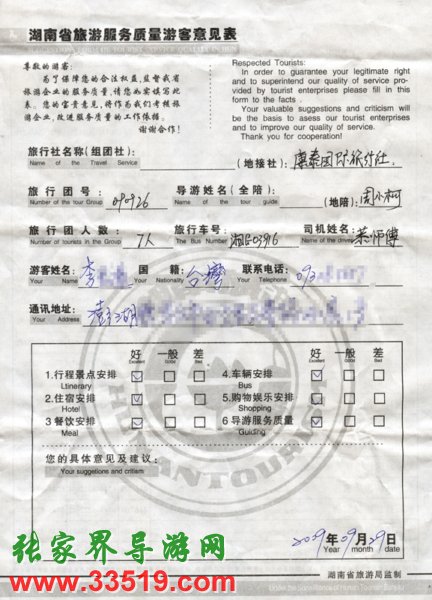 9月26日臺灣李先生一行7人接待質量反饋單:
