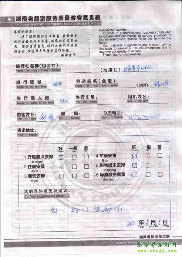 2010年8月8日鐘先生一行9位貴賓旅游質(zhì)量反饋