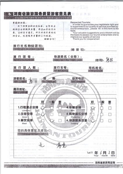 2011年6月2日康先生旅游質(zhì)量反饋:滿意