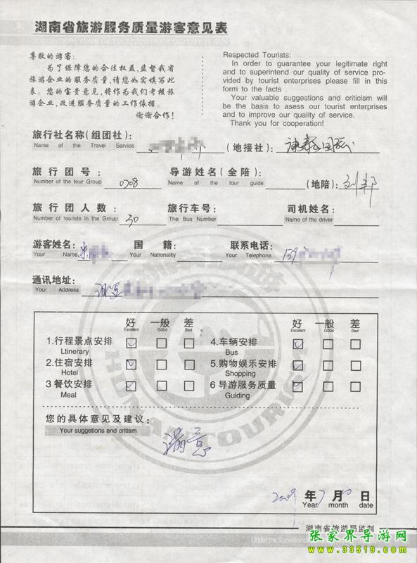 2009年7月8日汨羅朱先生一行30人質(zhì)量接待反饋單: